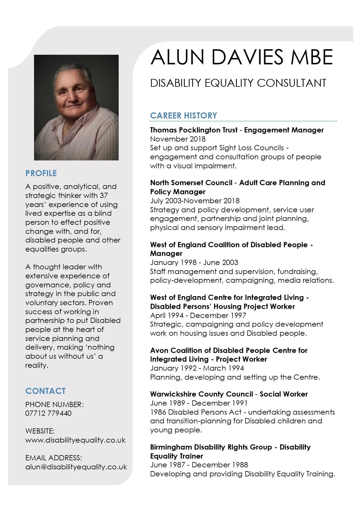 A positive, analytical, and strategic thinker with 37 years’ experience of using lived expertise as a blind person to effect positive change with, and for, disabled people and other equalities groups.